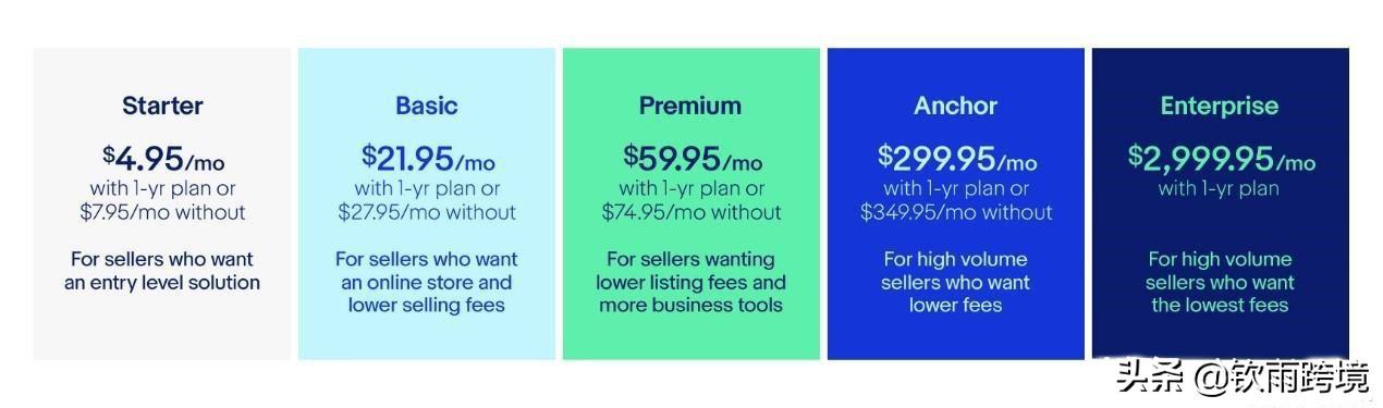在eBay美国站点,提供5种不同类型的店铺,分别是:Starter, Basic, Premium, Anchor和Enterprise。当您第一次订购时,您需要选择包月形式订购还是包年形式订购。无论您选哪一种方式,eBay都是以月度方式来收取订购费。