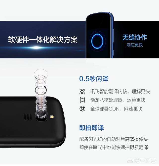 讯飞3.0后置摄像头。当你在国外逛街时,看到了自己喜欢的商品,但是看不懂参数和使用说明,都可以使用后置摄像头进行拍照,并且实时翻译,整个翻译时间大约是0.5秒,几乎是一边拍照一边翻译。这依赖于科大讯飞自研的翻译内核以及高通骁龙的无缝协作。
