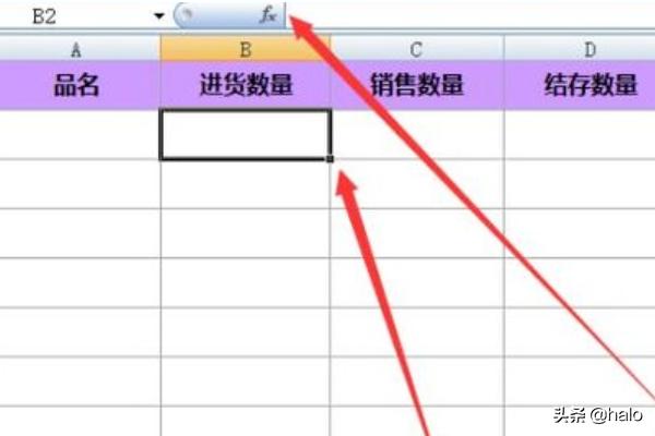 5、打开结存表,把鼠标放在b2单元格,之后点击公示栏的fx;
