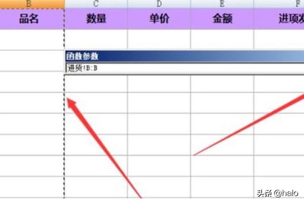 7、点击进货表之后,页面会跳转到进货表的界面,选择“品名”所在的整列;选择好后点击“参数函数”后面的向上箭头;