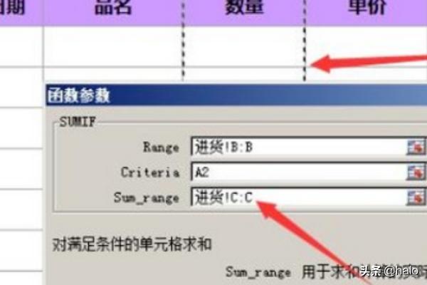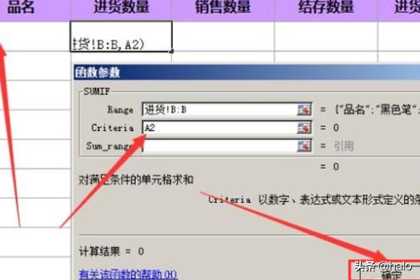 6、确定之后,页面会弹出“函数参数”, 用鼠标点击第一行末尾的向上箭头,点击后,参数函数会变成单独的一行,然后点击进货表;