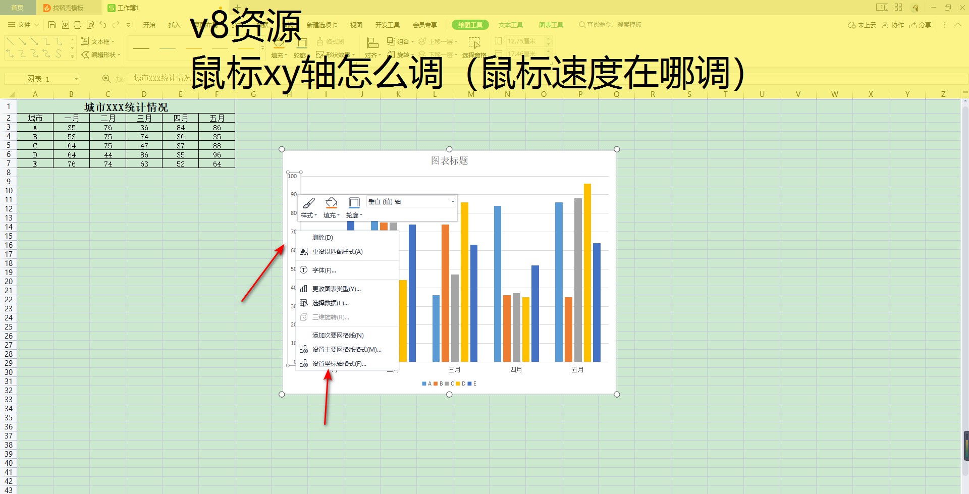那么我们的柱形图就会显示在页面上,之后将左侧的y轴选中,我们用鼠标右键进行点击选择【设置坐标轴格式】这个选项。